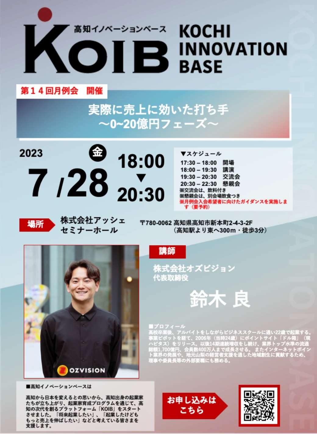 株式会社オズビジョン(本社:東京都渋谷区)の代表取締役の鈴木良が、2023年7月28日(金)のKOIB(高知イノベーションベース)の月例会にて講演をいたします。