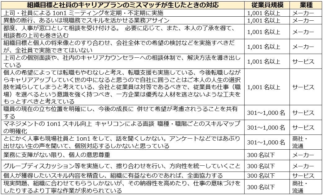 ▼組織目標と社員のキャリアプランのミスマッチが生じたときの対応(一部抜粋)
