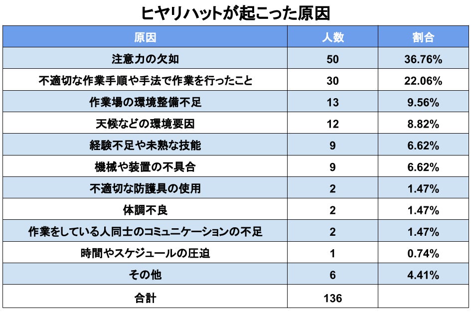 「ヒヤリハットが起こった原因は何ですか?」(n=136)と質問したところ、「注意力の欠如」と回答した人が最も多く36.76%、次いで「不適切な作業手順や手法で作業を行ったこと」が22.06%を占めました。