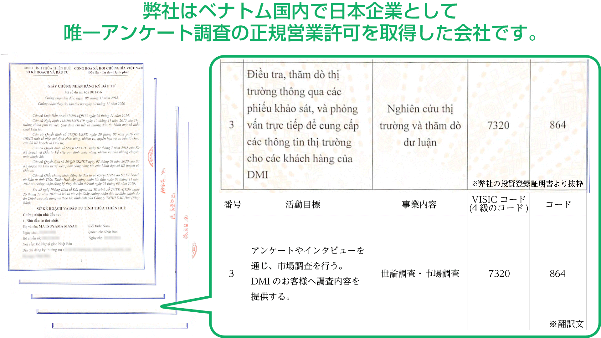 日本で唯一、ベトナム政府よりアンケート調査の営業許可を取得しています。