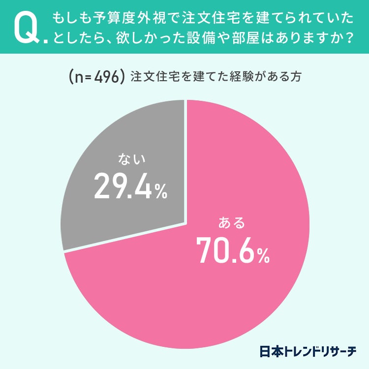 注文住宅を建てたことがある70.6%が、もし予算度外視だったら欲しかった設備や部屋が「ある」と回答しています。