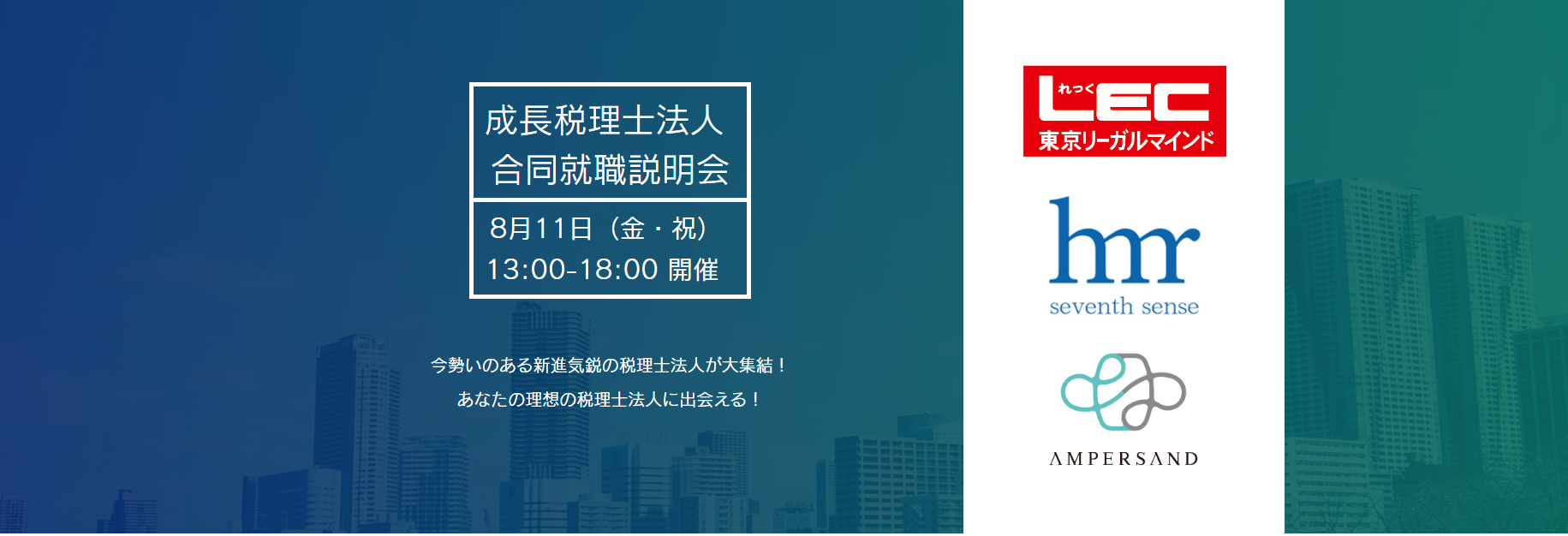 8月11日 (金・祝)、セブンセンスグループのセブンセンス 税理士法人 (本社:東京都台東区、代表:徐 瑛義、以下 「当社」 ) は、株式会社 LEC東京リーガルマインドおよびアンパサンド 税理士法人と共催で、10社の税理士法人による合同就職説明会を開催いたします。