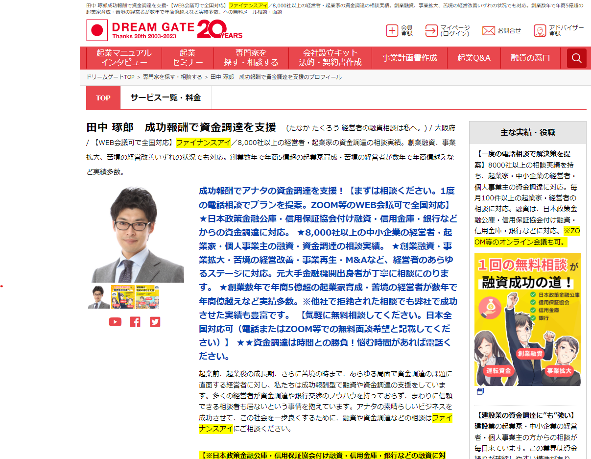 ファイナンスアイは、起業を目指す起業家予備軍や既に起業をされている方々、中小企業の経営者や個人事業主の皆様に対し、日本政策金融公庫や信用保証協会付け融資や信用金庫・銀行などの創業融資等のデット・ファイナンスによる資金調達の実現を目指し、成功報酬型のコンサルティングを提供しています。これまでに8,000社以上の経営者の資金調達の相談に応じ、現在も全国の経営者からの相談に対応し、毎月100件以上の新規相談に対応しています。ファイナンスアイは、これまで様々な業種業態、状況の資金調達や企業再生の支援をしてきました。その豊富な経験と幅広い知識で、多くの起業家や経営者の資金調達を成功させました。ファイナンスアイが起業時から支援してきた先には、数年で年商数億円を超える起業家の輩出も毎年増えており、今回、コロナ後の経済を活性化させていくために、スタートアップの創出および育成に貢献するため、20周年を迎えた日本最大級の起業支援プラットフォーム『ドリームゲート』にて認定アドバイザーとして活動を開始いたします。中小企業庁に登録済みのM&A支援機関でもあり、起業時の小規模事業承継型M&A(スモールM&A)等、中小企業の企業再生と次の世代への起業を橋渡しするようなM&Aの支援もあります。ファイナンスアイは今後もより一層、起業家・個人事業主・中小企業の経営者の皆さまの事業が維持・発展していけるように、サービスの充実に努めていくとともに、ファイナンスを支援する立場から地方創生と日本経済の発展に貢献してまいります。