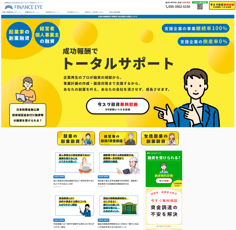 ファイナンスアイは、「1社でも多くの企業にファイナンスという活力を。継続的に成長していく支援をする事で、日本経済に貢献。」を理念に、起業家・個人事業主・中小企業の経営者に対し、成功報酬型で資金調達を支援しています。厳しい状況にある経営者にも積極的なサポートを行い、支援先はコロナ過にも負けず高い生存率を誇ります。ゼロゼロ融資による中小企業の倒産増加が顕在化してきた今、日本全国の経営者から毎日届く資金の悩み相談に対応し続けています。運営するWEBのオウンドメディアや各種SNSやLINE公式アカウントを通じて、大手金融機関出身者や財務コンサルタント、M&A支援機関のメンバーが監修した有益で視聴者や読者に分かりやすい情報を発信し続けています。サイトでは、融資が実現できる可能性を無料で診断するコンテンツも提供しており、毎日多くの経営者様にご利用頂いています。ファイナンスアイでは資金調達だけではなく、経営者の様々な相談にも応じています。経済産業省中小企業庁のM&A支援機関登録制度にも登録済で、小規模事業承継などによるM&Aの支援もしており、企業再生や経営改善といった困難な状況下で多くの経営者を支援してきた経験と知識を活かし、生存し続ける未来志向のサポートを提供しています。今回、日本最大級の起業支援プラットフォームであるドリームゲートの認定アドバイザーとしても活動を開始した事で、今後もファイナンスの支援を通じて皆さまの事業の維持・発展の支援を通じて、スタートアップの創出と育成、地方創生と日本経済の発展に寄与してまいります。