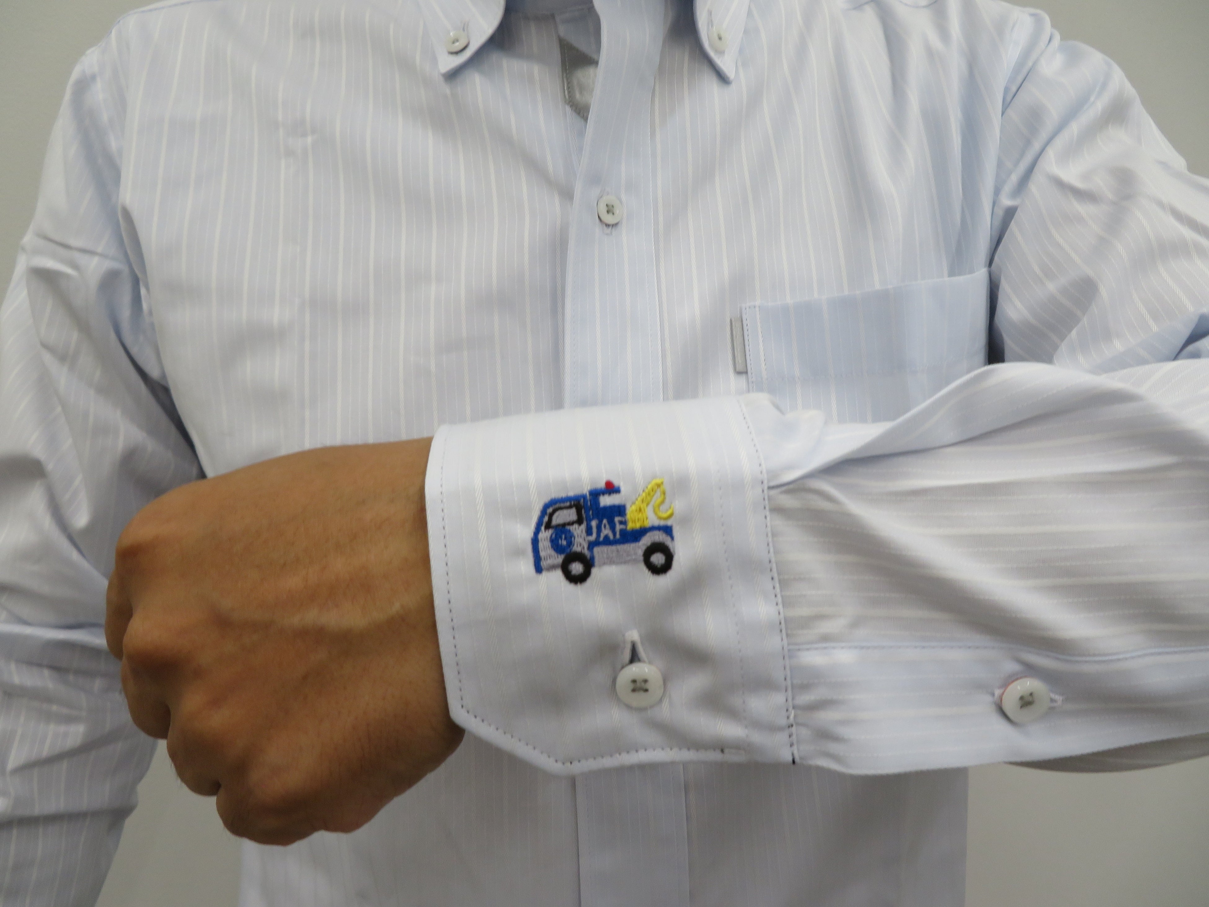 〇左カフスに入れたJAFレッカー車のワンポイント刺繍は、親しみやすいフォルムにこだわってデザインしました。