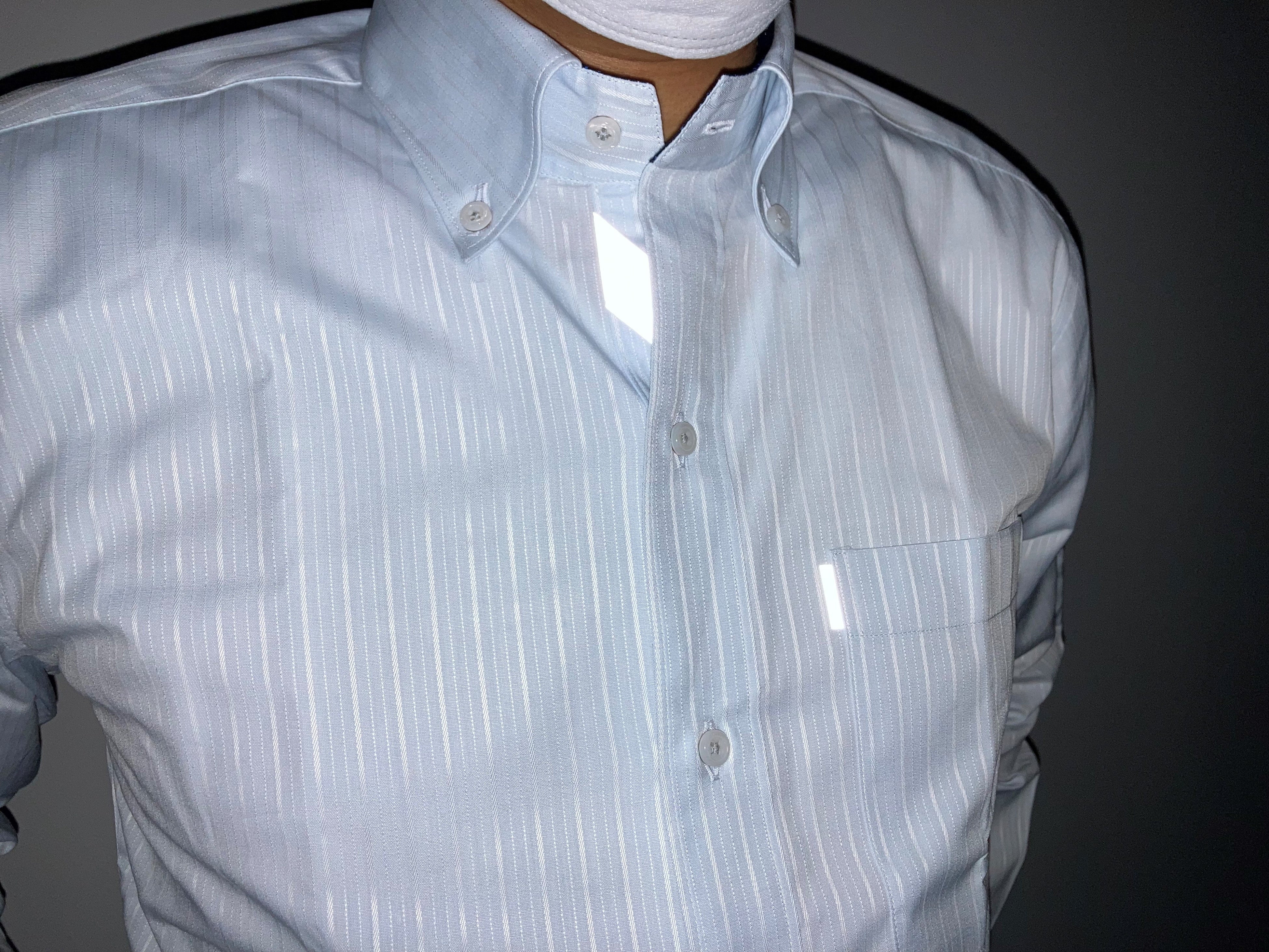 ワンポイント刺繍のほか、夜道や暗いところで車からの被視認性を高めることを目的として衿元や胸ポケットに株式会社 丸仁の反射材素材をほどこしております。