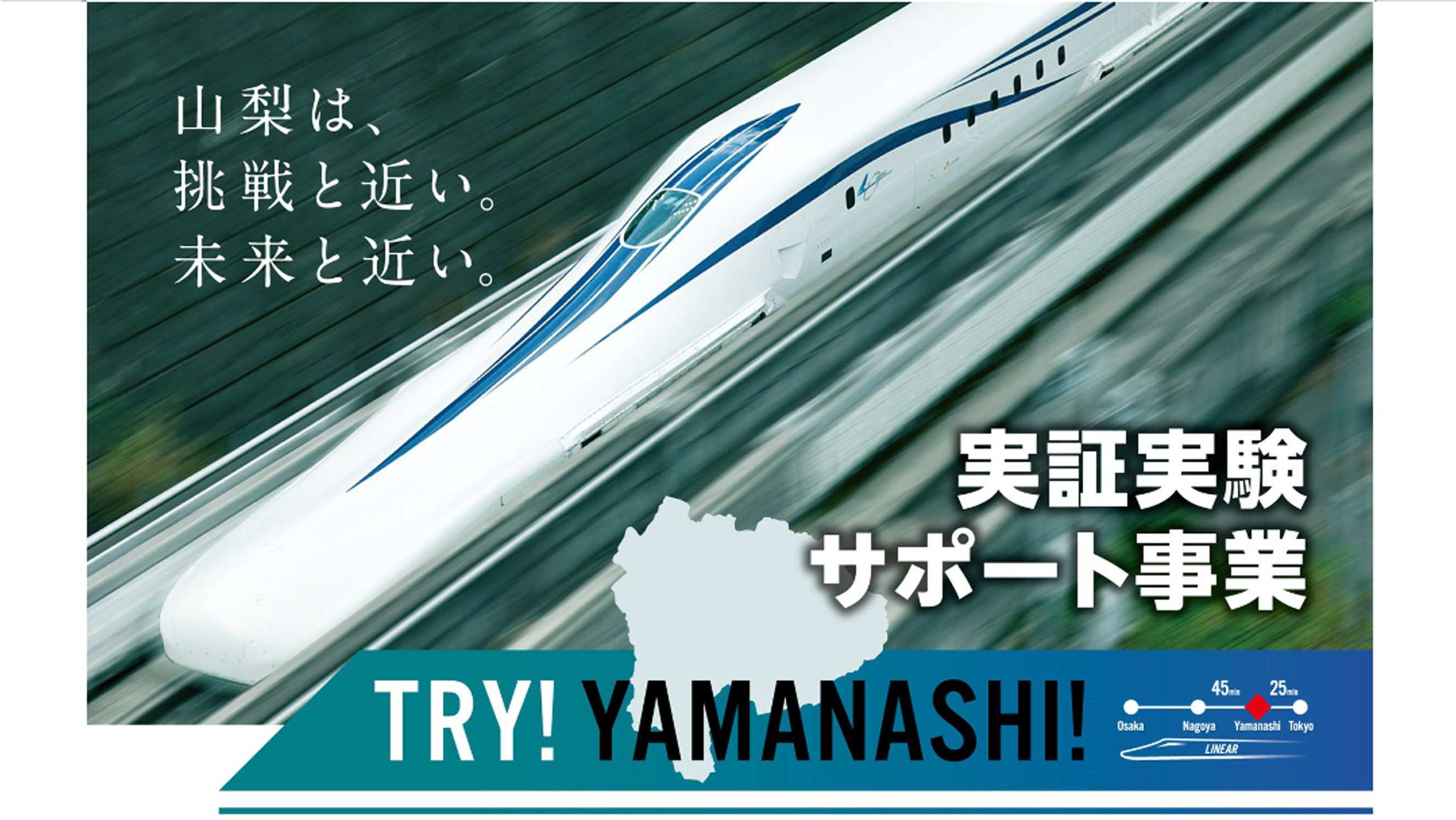 「TRY!YAMANASHI!実証実験サポート事業」は、最先端技術やサービスを有するスタートアップ企業等に対し、全国トップレベルとなる補助率3/4、最大750万円の経費を支援するとともに、山梨県全域を実証実験のフィールドとして、産学官金連携のオール山梨体制で伴走支援する社会実証プロジェクトです。