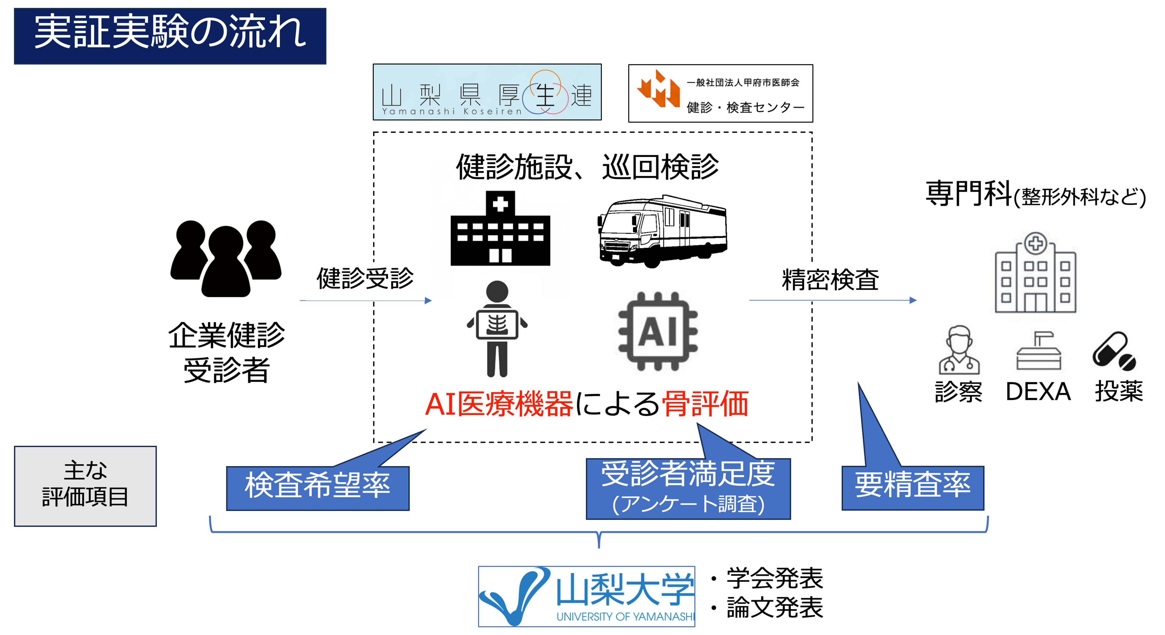 本実証実験では、検査選択率や要精査率、精密検査結果に基づく有病率、そしてこれらをもとに試算される将来的な医療費削減効果が検証項目となります。これらの検証結果は学術的な記録としてまとめられ、学会発表や論文発表を通じて全世界に向けて発信される予定です。