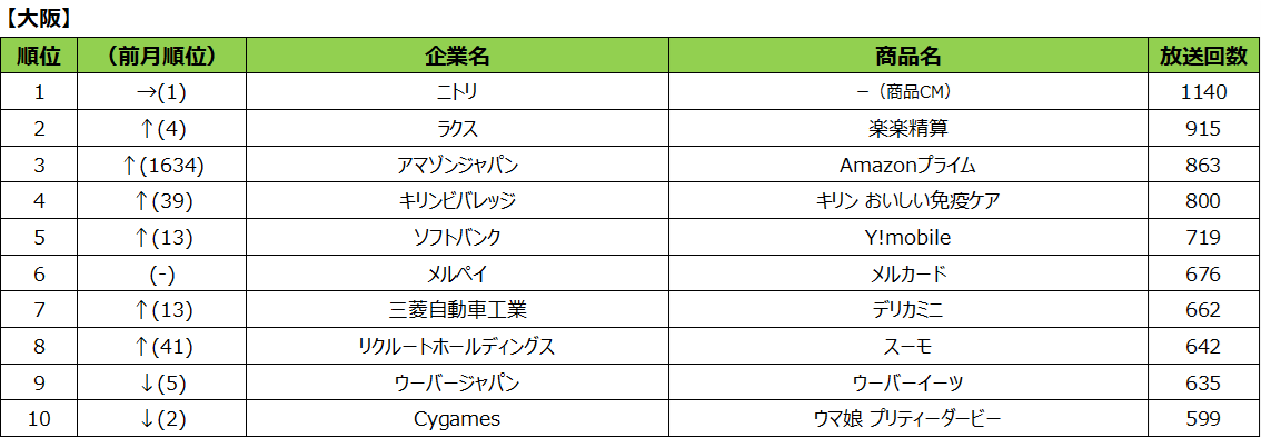 商品別ランキング10位のユー・エス・ジェイ「ユニバーサル・スタジオ・ジャパン」の放送回数2689回のうち、4割以上となる1137回が名古屋地区での放送でした。同CMは名古屋地区で1位となりましたが、他の地区ではランキング圏外でした。ニトリの商品CMの放送回数は、東京地区・大阪地区では1100回以上、名古屋地区では957回でしたが、福岡地区・札幌地区では約520回でした。店舗数が多い東名阪エリアでの放送を増やし、近隣住民の集客を図っていると考えられます。