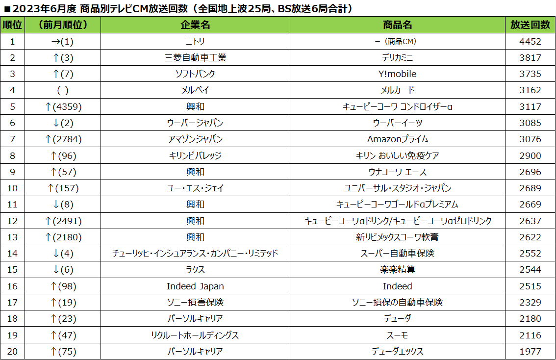 2023年6月度の商品別ランキングは、1位にニトリの商品CM、2位に三菱自動車工業「デリカミニ」、3位にソフトバンク「Y!mobile」となりました。ニトリの商品CMは、3か月連続で1位となりました。三菱自動車工業「デリカミニ」は、2023年4月度から毎月順位を1つずつ上げてランクインしています。