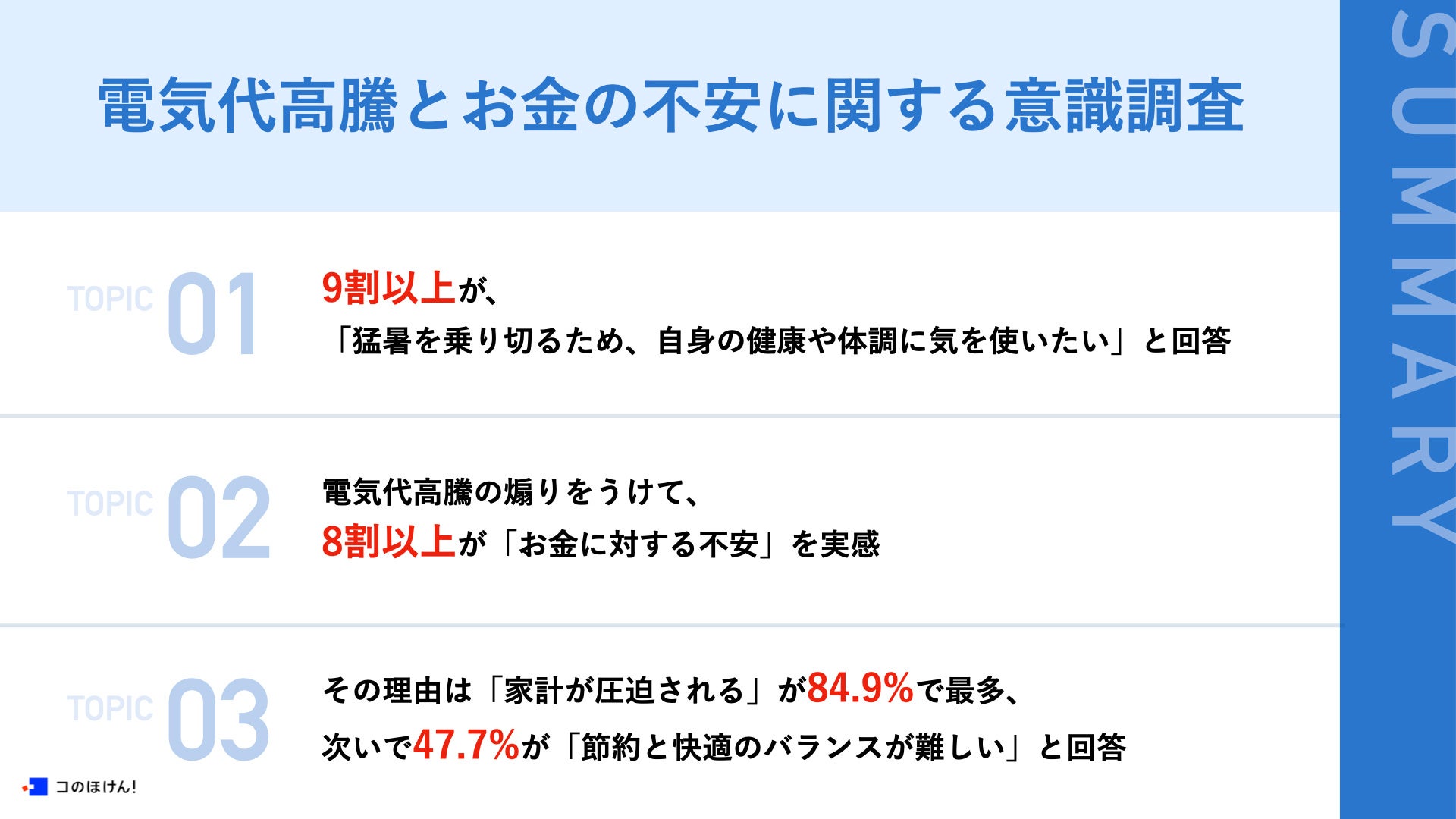 今回の調査では、電気代高騰の煽りを受け、共働き家庭ではお金に対する不安が高まっていることが明らかになりました。中でも、電気代高騰による家計の圧迫に対しての不安が強く、中には、教育費や老後資金が十分に確保できなくなるのではないかと、心配の声も聞かれました。今年も厳しい暑さが予想されているため、健康への「備え」と共に、お金への「備え」も講じてみてはいかがでしょうか。