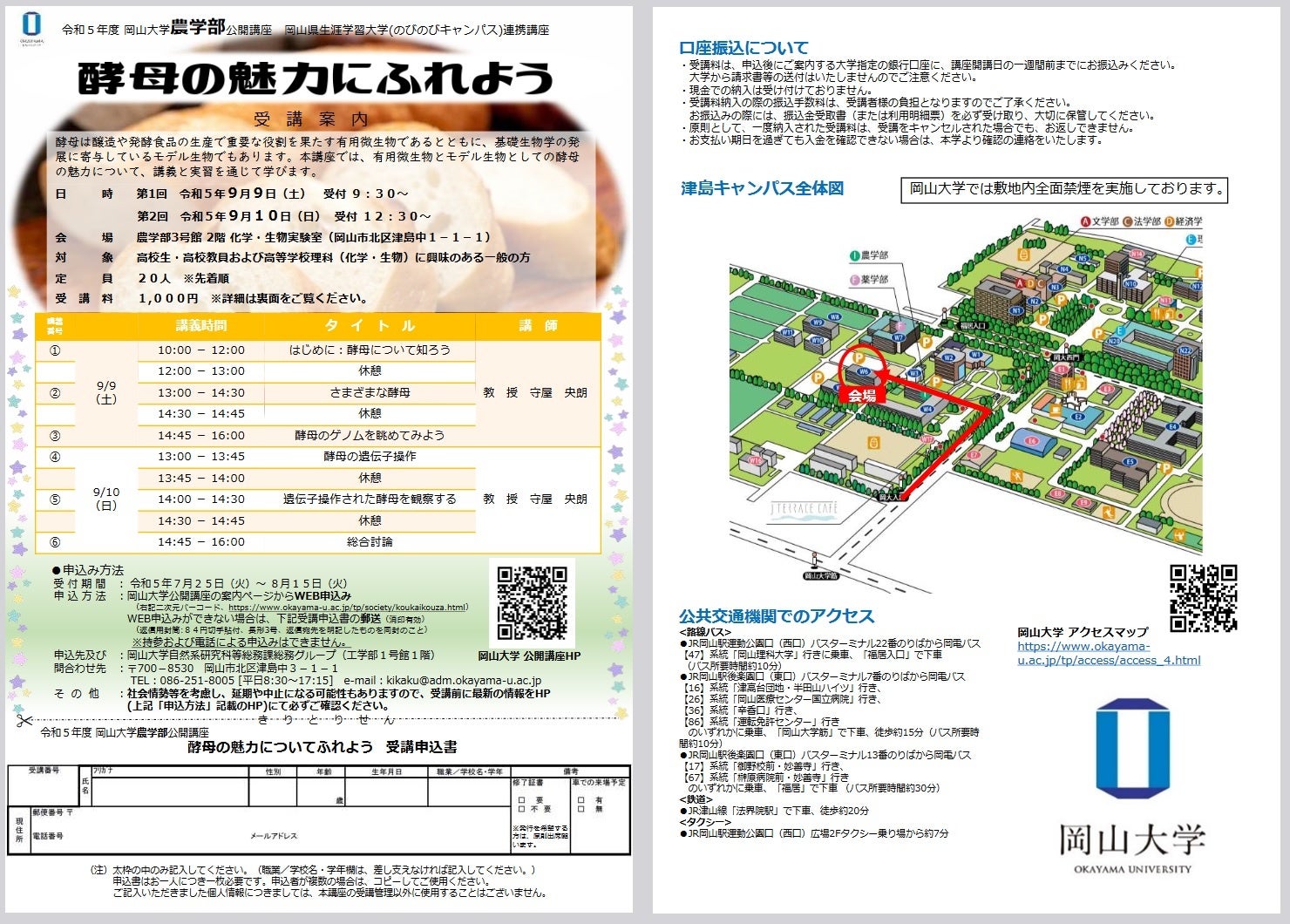 下記の岡山大学ホームページ公開講座(講座No.7)からWEBのお申込みをお願いします。
