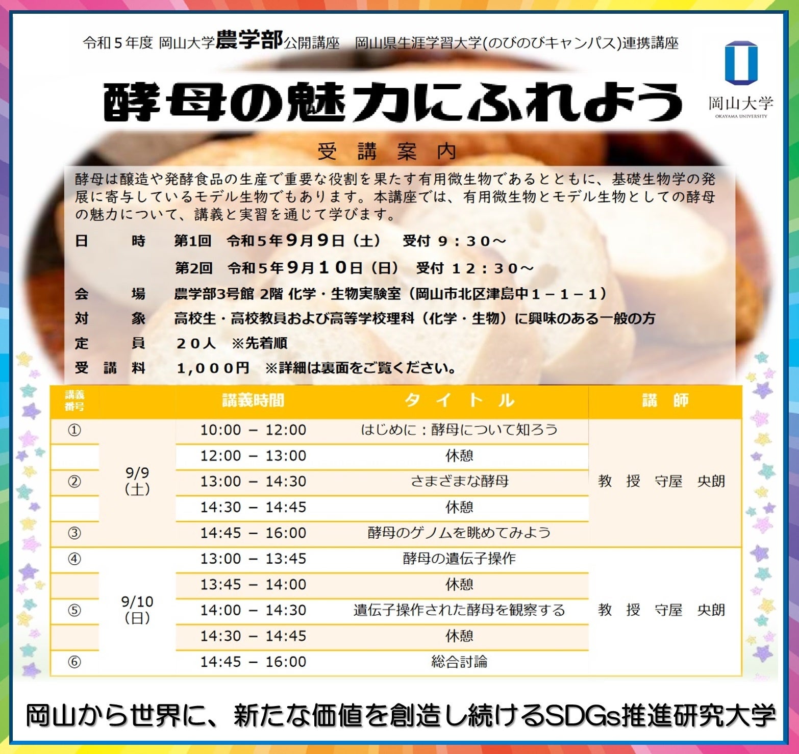 国立大学法人岡山大学(本部:岡山市北区、学長:那須保友)の農学部では、公開講座「酵母の魅力にふれよう」を2023年9月9日~9月10日の2回、本学津島キャンパスの農学部3号館で開催します。