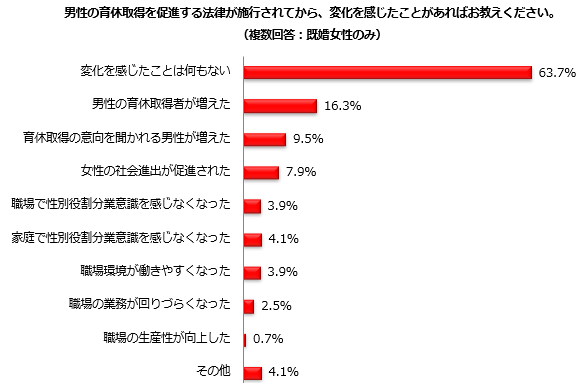 また、結婚している女性に「男性の育休取得を促進する法律が施行されてから、変化を感じたことがあればお教えください」と尋ねたところ、最も多かったのは「変化を感じたことは何もない」で63.7%でした。それに対し、結婚していない女性の同比率は58.4%とやや減少します。一方、「女性の社会進出が促進された」「職場で性別役割分業意識を感じなくなった」「家庭で性別役割分業意識を感じなくなった」と、女性を取り巻くポジティブな項目においては、結婚していない女性の方が結婚している女性より高くなっています。2022年4月から男性の育休取得を促進する法律が段階的に施行されてから一年が経ちましたが、まだ成果はこれからで結婚している女性の方がよりシビアに評価しているようです。「男性が働き、女性は家事・育児」という考え方は、これまで日本社会に長く根づいてきました。そんな性別役割分業意識が一朝一夕で変わるものではないと思いますが、「男性の育休取得者が増えた」と評価する声も16.3%あります。継続して着実に、環境改善に取り組むことが大切なのだと考えます。