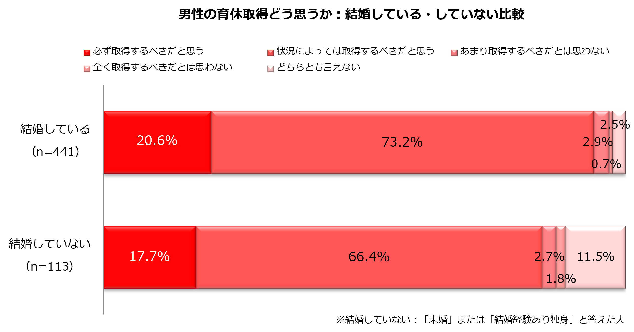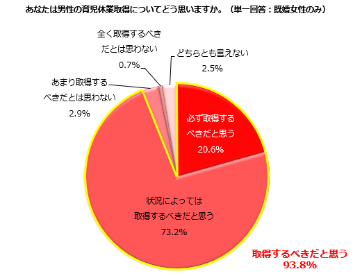 以前、主婦層を中心とする就労志向の女性に「あなたは男性の育児休業取得についてどう思いますか」と尋ねたところ91.8%が「取得するべきだと思う」と回答しました(※)。今回、同調査を結婚している女性に限定して再集計したところ、「取得するべきだと思う」と回答した比率が93.8%とさらに高くなりました。一方、結婚していない女性に絞ると同比率は84.1%でした。いずれも高い数値ではあるものの、結婚している女性の方が10ポイント近く高くなっており、男性の育休取得により切実な思いを持っていることが伺えます。