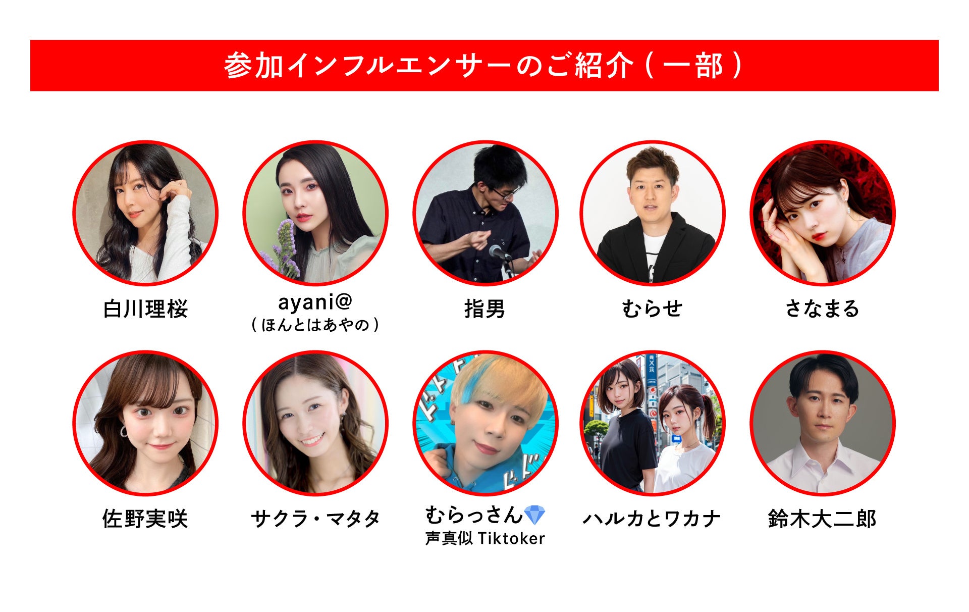 左から 白川理桜/ayani@(ほんとはあやの)/指男/むらせ/さなまる/佐野実咲/サクラ・マタタ/むらっさん 声真似Tiktoker/ハルカとワカナ(AIインフルエンサー)/鈴木大二郎