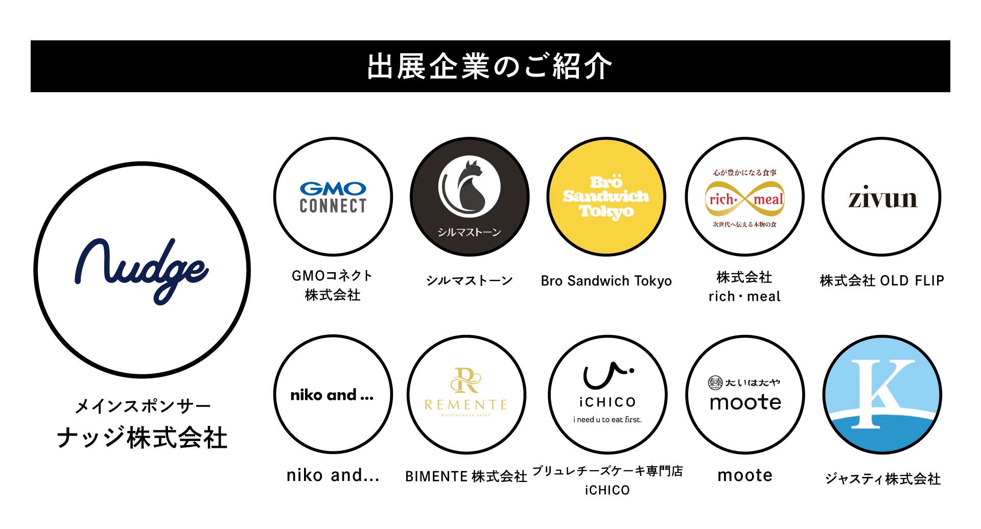左からナッジ株式会社/GMOコネクト株式会社/シルマストーン/Bro Sandwich Tokyo /株式会社rich・meal/株式会社OLD FLIP/nikoand…/BIMENTE株式会社/iCHICO/moote/ジャスティ株式会社