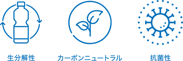 PLA(ポリ乳酸)は原料にトウモロコシなどのバイオマスを使用しているので植物の生育過程でCO2 を吸収しており、焼却しても大気中のCO2を増加させないカーボンニュートラルな素材です。また、原料製造時のCO2 の排出量はポリエステルと比べても1/7 となるなど、原料製造時のCO2 排出量の削減も期待できます。更に、一定の条件下で水と二酸化炭素に分解される生分解性を有しており、製品の使用後は自然に還る理想的なサイクルを実現できます。機能としては、乳酸を原料とするため天然の抗菌性を有しており、近年繊維素材としても注目を集めています。