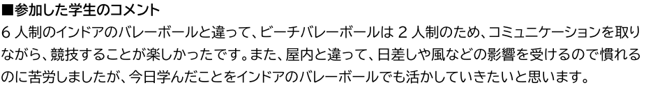 今回開催した「AKTIO アンダーエイジ・ビーチバレーボール・アカデミー」vol.4では、現役のプロビーチバレーボール選手が、部活動でビーチバレーボールやインドアのバレーボールに取り組む高校生を対象に、試合での戦略や戦術、コンビネーション、勝利への考え方などについて実践形式で指導をしたり、ゲーム練習を行いました。
