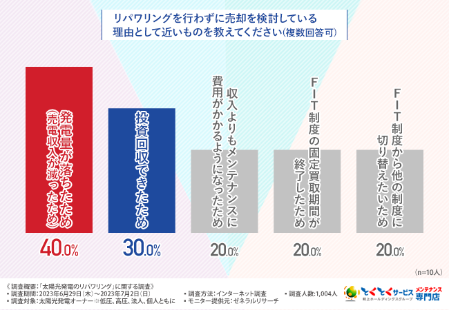 先ほどの質問で、「リパワリングを行わずに売却を検討している」と回答した方(10人)に、「リパワリングを行わずに売却を検討している理由として近いものを教えてください(複数回答可)」と質問したところ、『発電量が落ちたため(売電収入が減ったため)(40.0%)』と回答した方が最も多く、次いで『投資回収できたため(30.0%)』『収入よりもメンテナンスに費用がかかるようになったため(20.0%)』『FIT制度の固定買取期間が終了したため(20.0%)』『FIT制度から他の制度に切り替えたいため(20.0%)』と続きました。