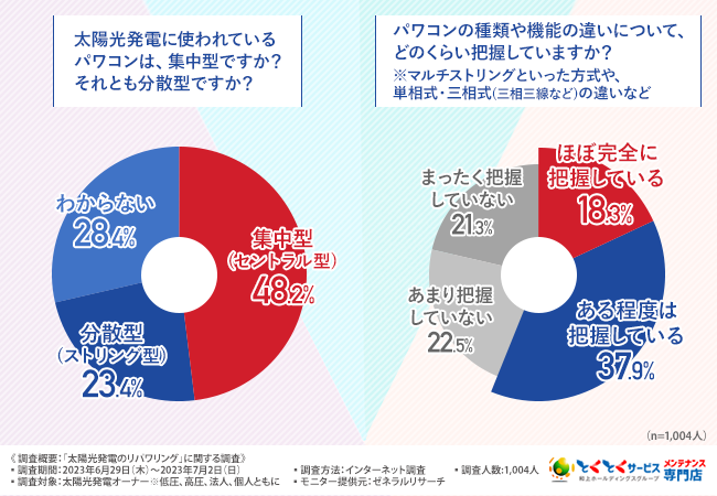 「太陽光発電に使われているパワコンは、集中型ですか?それとも分散型ですか?」と質問したところ、『集中型(セントラル型)(48.2%)』『分散型(ストリング型)(23.4%)』『わからない(28.4%)』という回答結果になりました。