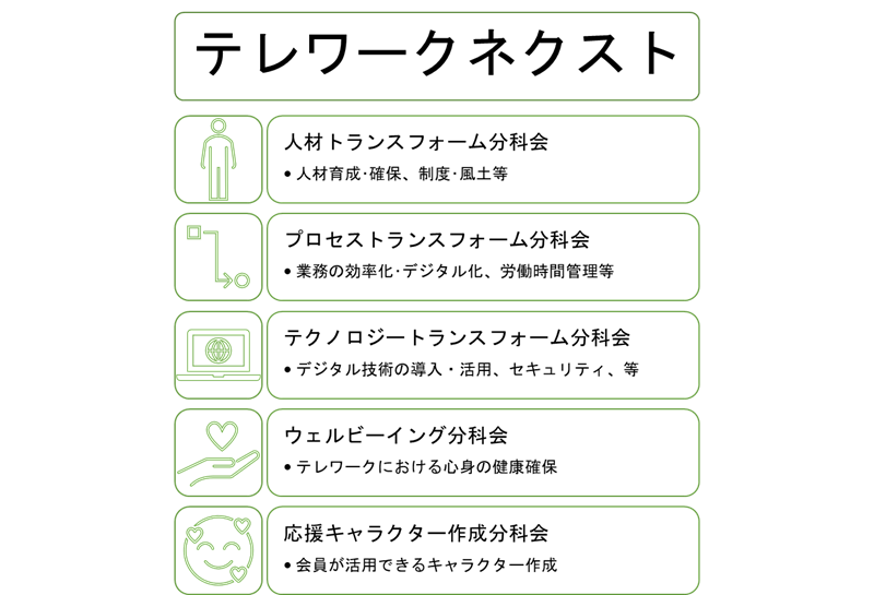 一般社団法人日本テレワーク協会(会長:栗原 博、所在地:東京都千代田区、以下JTA)は、会員の皆様とともにテレワークの進化とノウハウをまとめ、世の中へ発信するプロジェクト「テレワークネクスト」(以下、プロジェクト)を令和5年7月からスタートします。JTA会員限定プロジェクトとして38社・団体が参加し、人材トランスフォーム分科会、プロセストランスフォーム分科会、テクノロジートランスフォーム分科会、ウェルビーイング分科会、テレワークネクスト応援キャラクター作成分科会の5分科会に分かれて検討を進め、12月にプレスリリースでの公開、1月11日JTAアニュアルカンファレンスでの成果発表会に臨みます。
