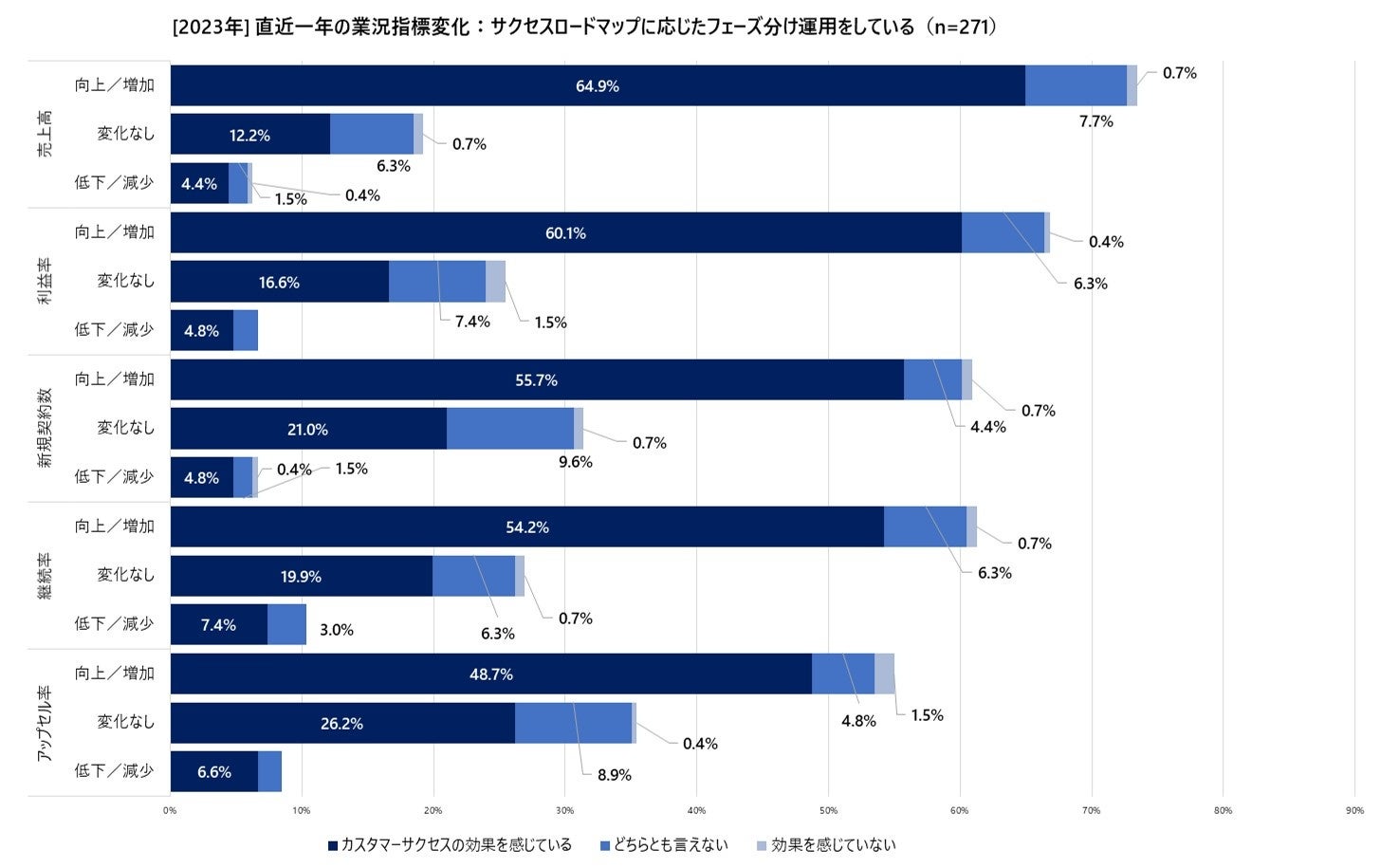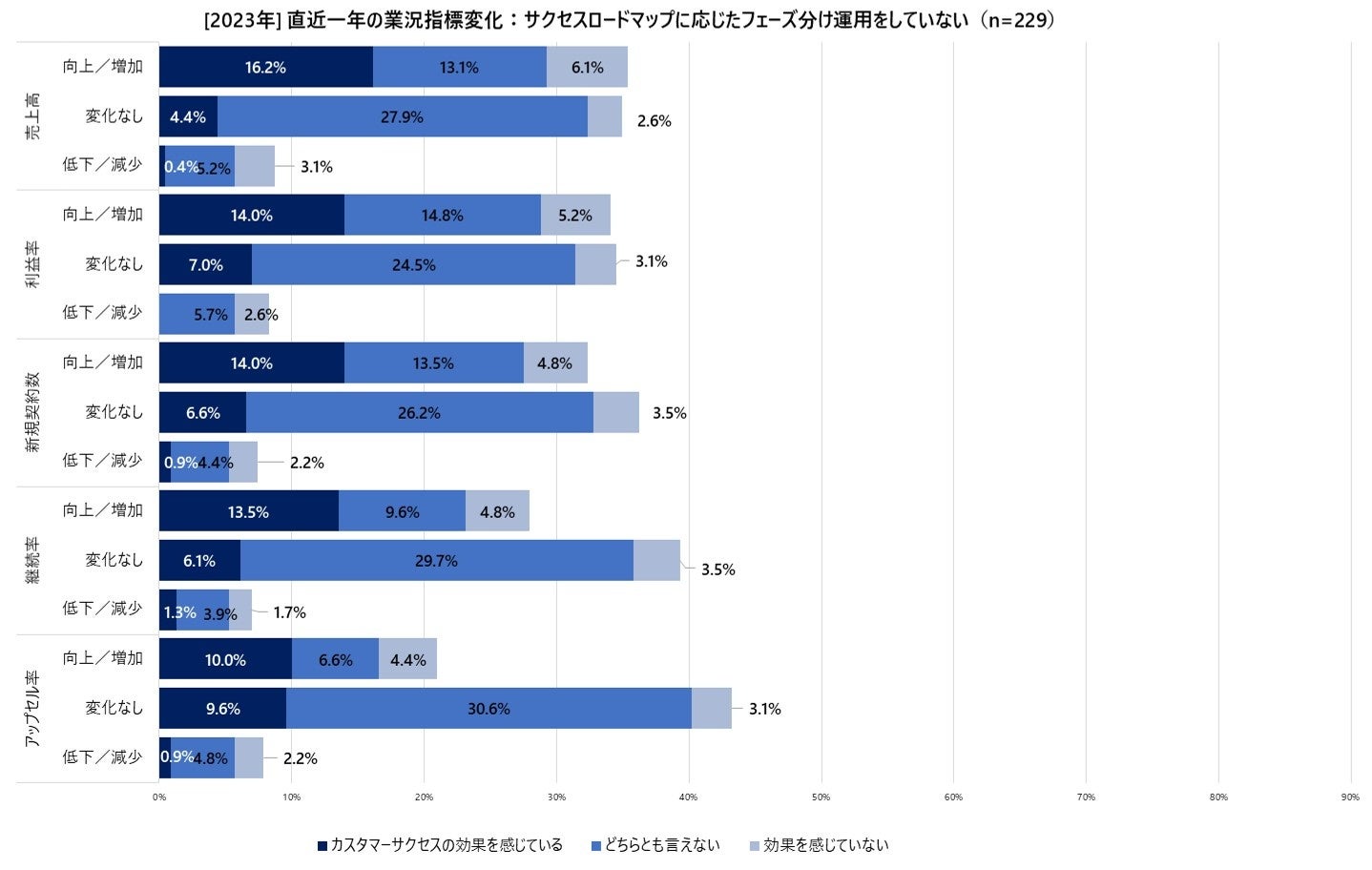「サクセスロードマップに応じたフェーズ分け運用」を行っている層においても、各指標において直近一年で「向上した/増加した」と回答している人が圧倒的に多く、また効果を体感している人が多いことがわかります。フェーズ分け運用を行っていない層においては、こちらも「変化なし」の割合が高くなっているとともに、効果についても「どちらとも言えない」と感じている人が多い結果となっています。