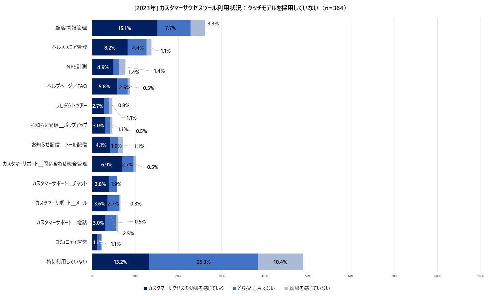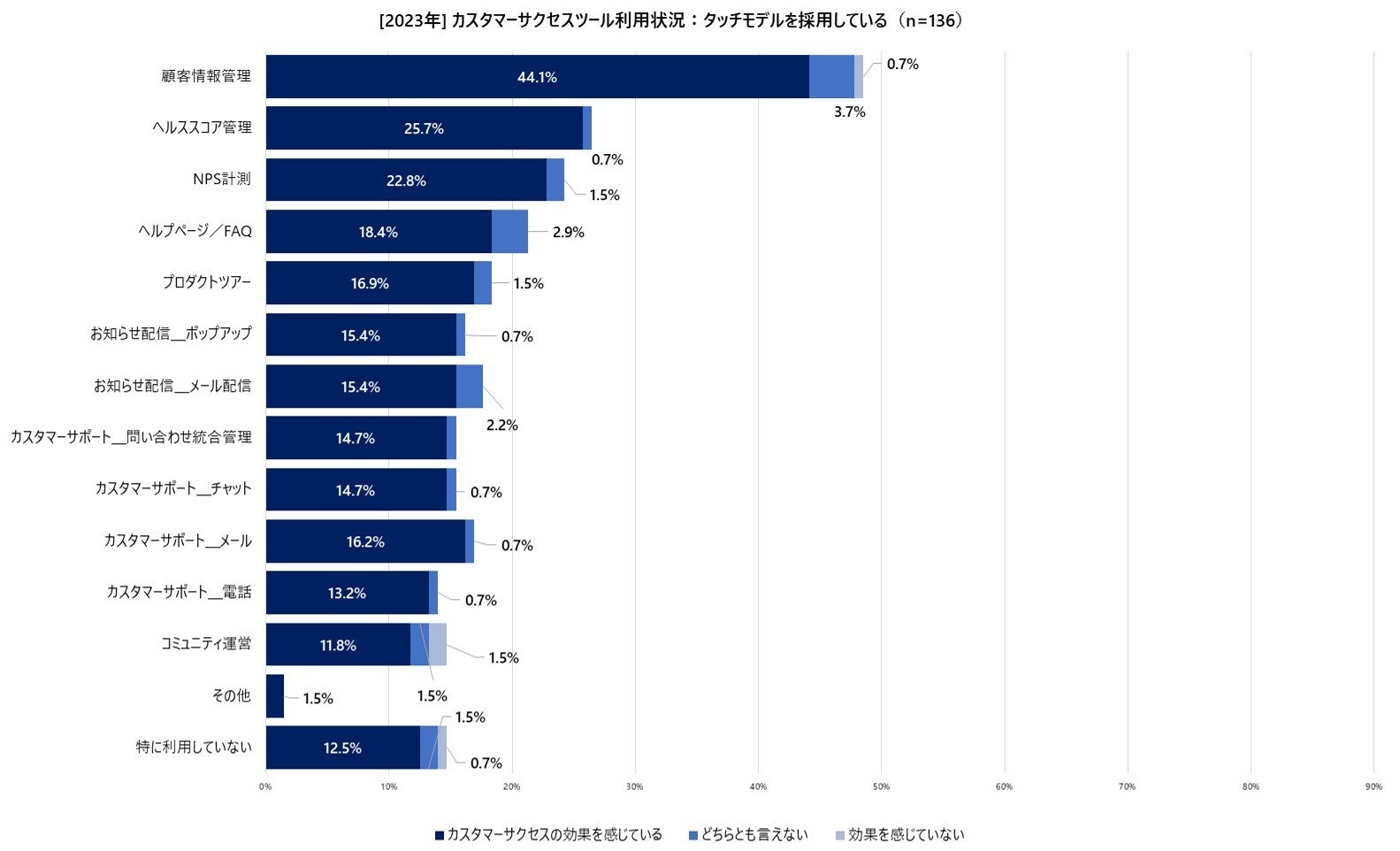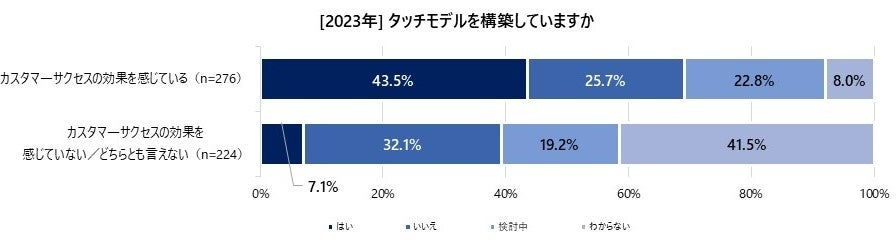カスタマーサクセスの効果を感じている層、感じていない/どちらとも言えない層それぞれに、カスタマーサクセスの運用について尋ねてみたところ、効果を感じている層の43.5%が「タッチモデルを構築している」と回答しました。これは昨年の38.1%から5.4ポイントアップしています。しかし効果を感じていない/どちらとも言えない層では昨年よりは増加したものの、1割にも満たない7.1%にとどまる結果となりました。