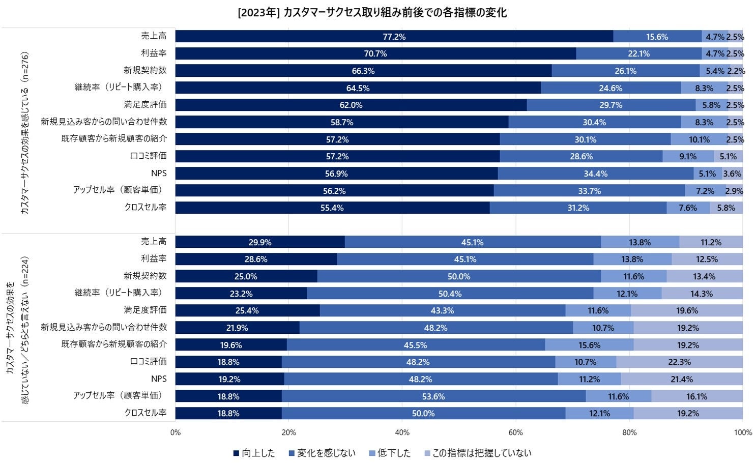 次にカスタマーサクセス取り組み前後で各指標がどのように変化をしたかを聞いてみたところ、カスタマーサクセスの効果を感じている層と、感じていない/どちらとも言えない層では引き続き大きな差が浮き彫りとなりました。効果を感じている層で「売上高が向上したと感じる」と回答した人は77.2%と一番多く、同じく一番多かった昨年よりも2.6ポイント増となっています。そのほかの指標についても半数以上~7割の人が向上したと感じており、カスタマーサクセスの効果ははっきりと出ている様子が伺えます。対して感じていない/どちらとも言えない層においてはいずれの指標においても向上したと感じている人は3割に満たず、また各指標を「把握していない」と答えた人が、効果を感じている人と比べても随分多いことがわかります。
