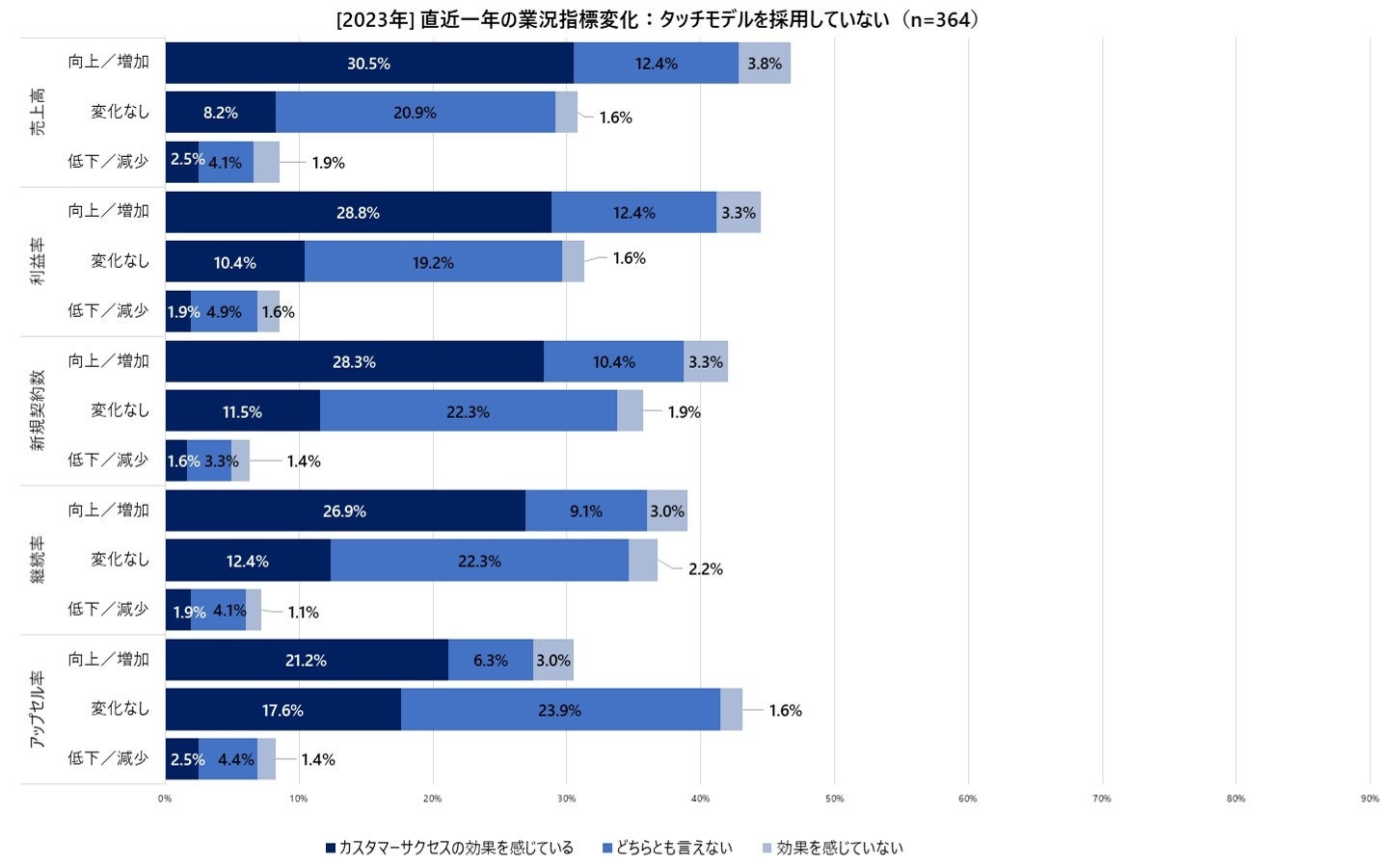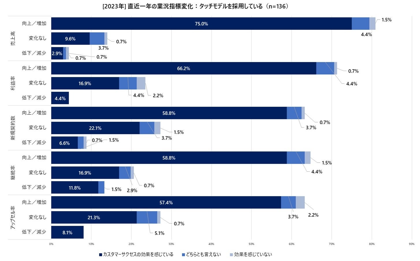 同様にタッチモデル採用有無、フェーズ分け運用有無で、今度は業況に関する指標に差があるかを見ていきます。直近一年の売上高、利益率、新規契約数、継続率、アップセル率すべての指標において、タッチモデルを採用している層がの多くが「向上した/増加した」と回答しています。反対にタッチモデルを採用していない層では、各指標に「変化なし」と答えている割合も高く、その人たちがカスタマーサクセスに取り組んでいるものの、指標に変化が見られないがゆえ「効果があるともないともどちらとも言えない」と感じていることが推察されます。
