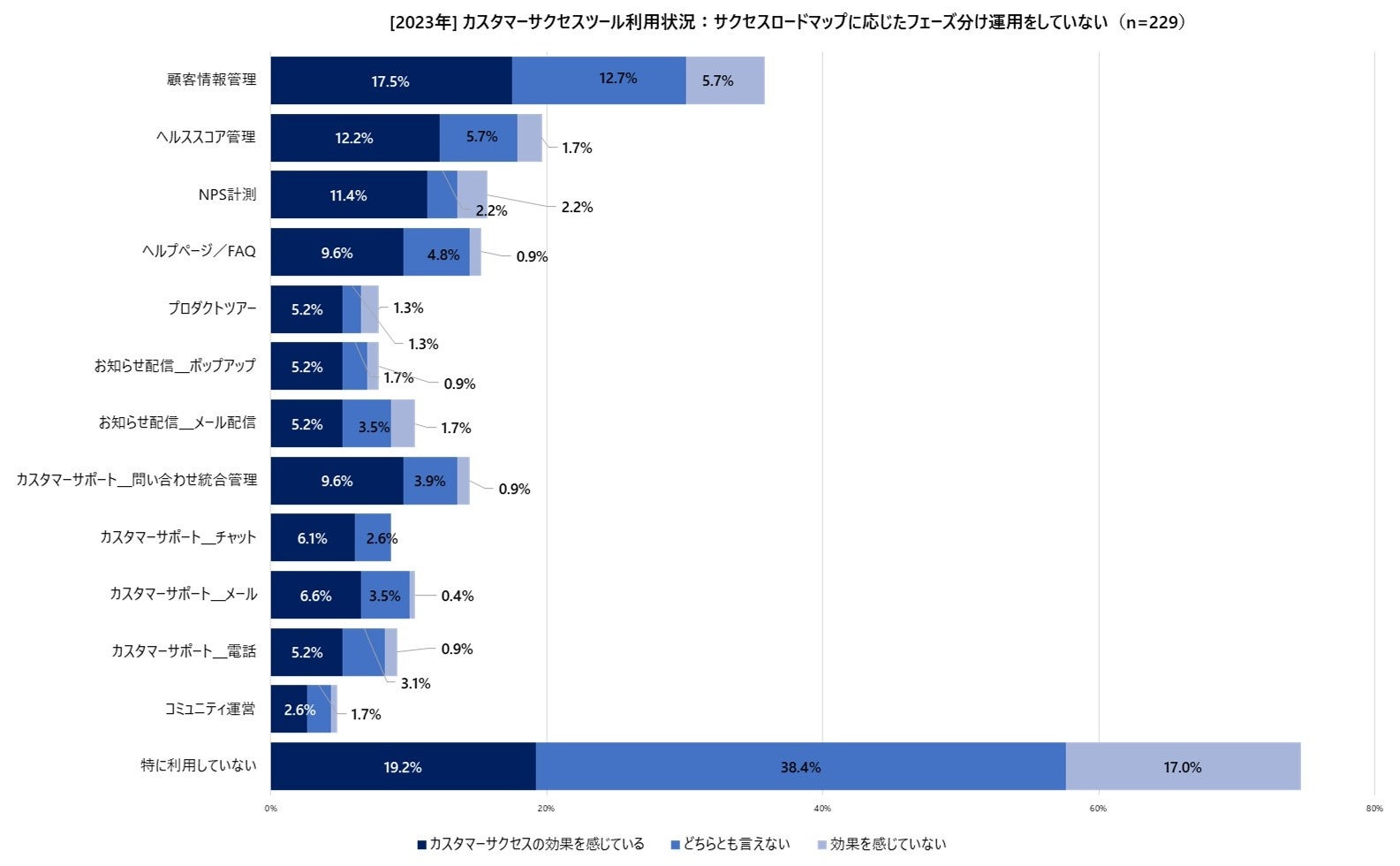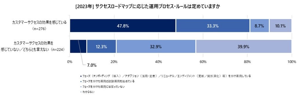 次に「サクセスロードマップに応じた運用プロセス・ルールは定めていますか?」と尋ねたところ、昨年とほぼ同様に効果を感じている層の約半数、47.8%がフェーズを分けた運用をしているとのことでした。加えて32.3%の人はフェーズ分けの試験運用を始めているとのことです。対して効果を感じていない/どちらとも言えない層では、フェーズ分け運用をしている人が昨年より0.8ポイントアップの7%で、こちらも一割に満たない結果となりました。