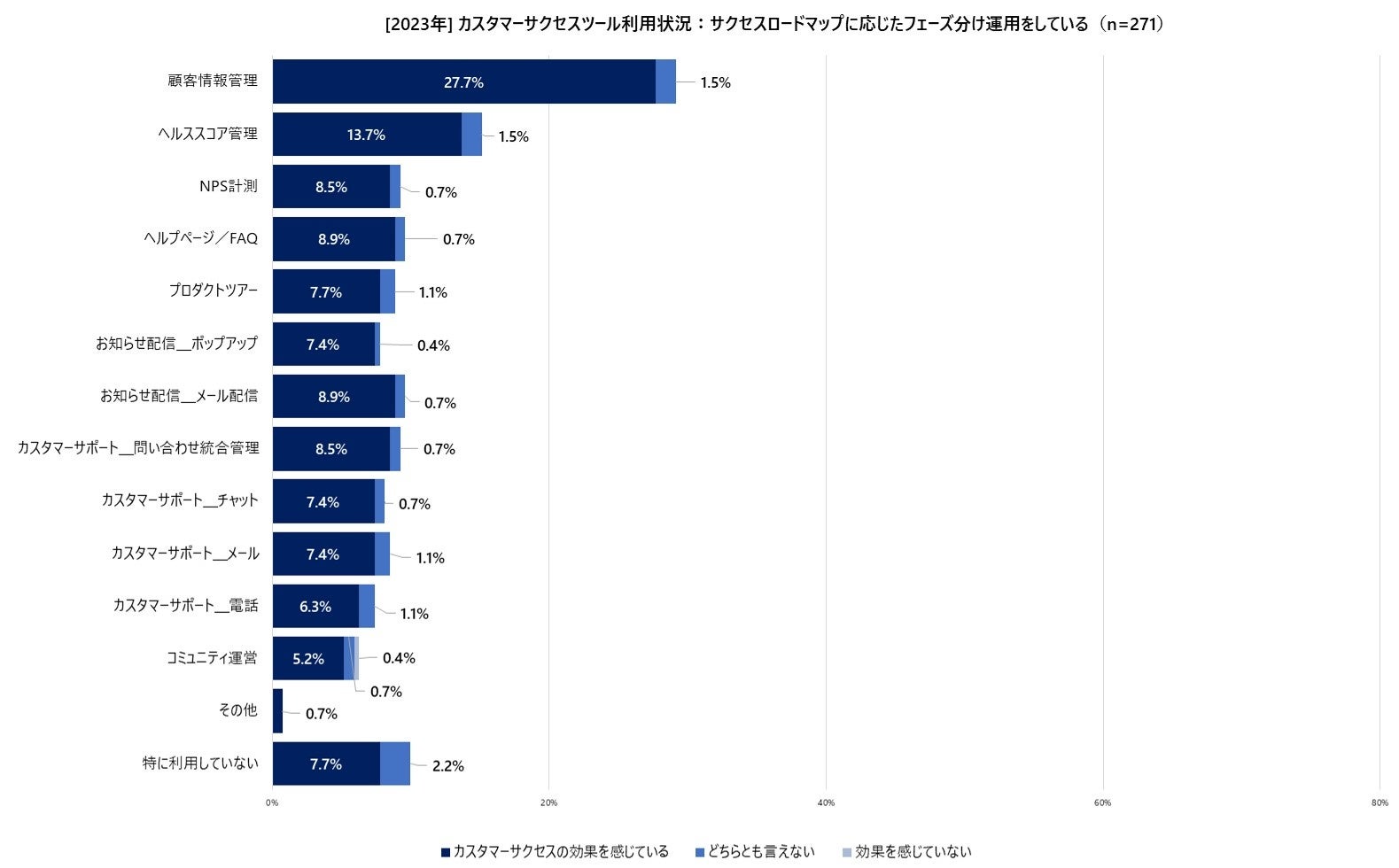 次は「サクセスロードマップに応じたフェーズ分け運用(導入/活用・定着/更新/関係深化等)」を行っている層、行っていない層別で、カスタマーサクセスツールの利用状況と効果体感を見ていきます。こちらはそれぞれのツール導入率に対して、フェーズ分け運用を行っている方の層が「カスタマーサクセスの効果を感じている」割合が非常に高いことがわかります。また、フェーズ分け運用を行っていない層の7割強は、カスタマーツールを利用していません。これらのことから、ツールの活用においても、ただ導入するだけではなく、その活用に伴うルール作り、つまり「サイエンス」が非常に重要であることがわかります。
