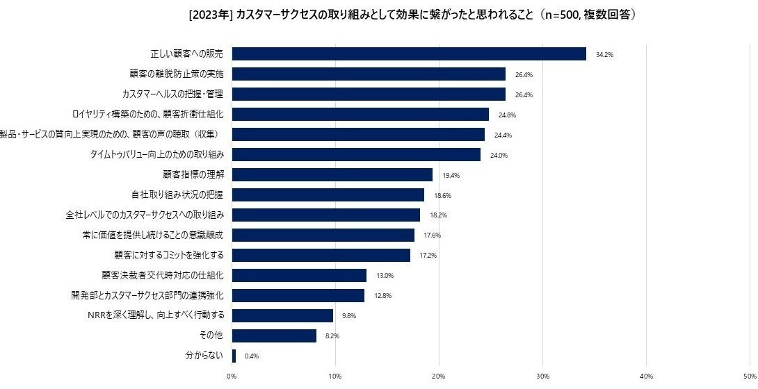 カスタマーサクセスの取り組みを行っているすべての人に対して、効果に繋がったと思われる取り組みについて聞いたところ、一番多かったのは「正しい顧客への販売」で34.2%、次いで「顧客の離脱防止策の実施」、「カスタマーヘルスの把握・管理」がいずれも26.4%でした。