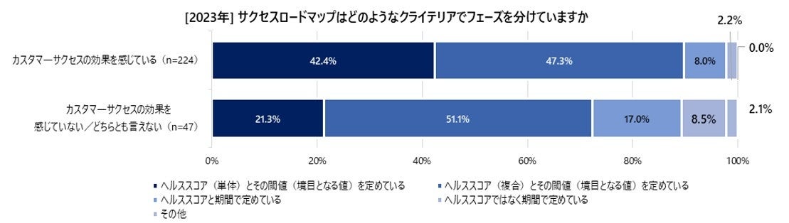 さらにそのフェーズ分け運用を行っている人に対し、どのようなクライテリアでサクセスロードマップをフェーズ分けしているかを聞いたところ、いずれの層も一番多かったのは「ヘルススコア(複合)とその閾値を定めている」で、効果を感じている層においては224人中47.3%、効果を感じていない/どちらとも言えない層においては47人中の51.1%でした。「ヘルススコア(単体)とその閾値を定めている」のは、効果を感じている層で42.4%、効果を感じていない/どちらとも言えない層では21.3%という結果になりました。