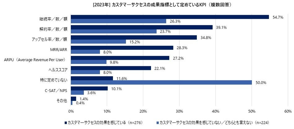次に、成果指標として定めているKPIについて尋ねてみると、効果を感じている人の54.7%が「継続率/数/額」を挙げており、これは昨年よりも2.5ポイントの上昇、次いで「解約率/数/額」は昨年より1.4ポイント減少の39.1%、「アップセル率/数/額」は34.8%と昨年より2.4ポイント上昇、という結果となりました。昨年と比べ多少の増減はあるものの、効果を感じている人たちは特にこれらの指標を重視していることがわかります。これに対して効果を感じていない/どちらとも言えない人では、昨年同様半数以上の人が成果指標として定めているKPIは特にないという結果になりました。一番回答が多い指標だった「解約率/数/額」を見ても、設定しているのは4分の1だけのようです。