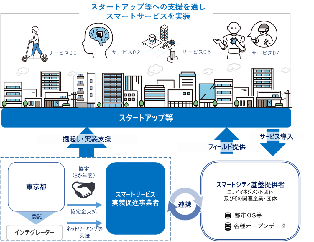 東京都は、デジタルの力で東京のポテンシャルを引き出し、都民が質の高い生活を送ることができる「スマート東京」の実現を目指しています。「Be Smart Tokyo」は、スマート東京の実現に向けたスマートサービスの実装を加速させるため、都市OS等のスマートシティ基盤を提供するエリアマネジメント団体等(「スマートシティ基盤提供者等*2」)と「スタートアップ等*3」とが協業可能な枠組みを構築します。