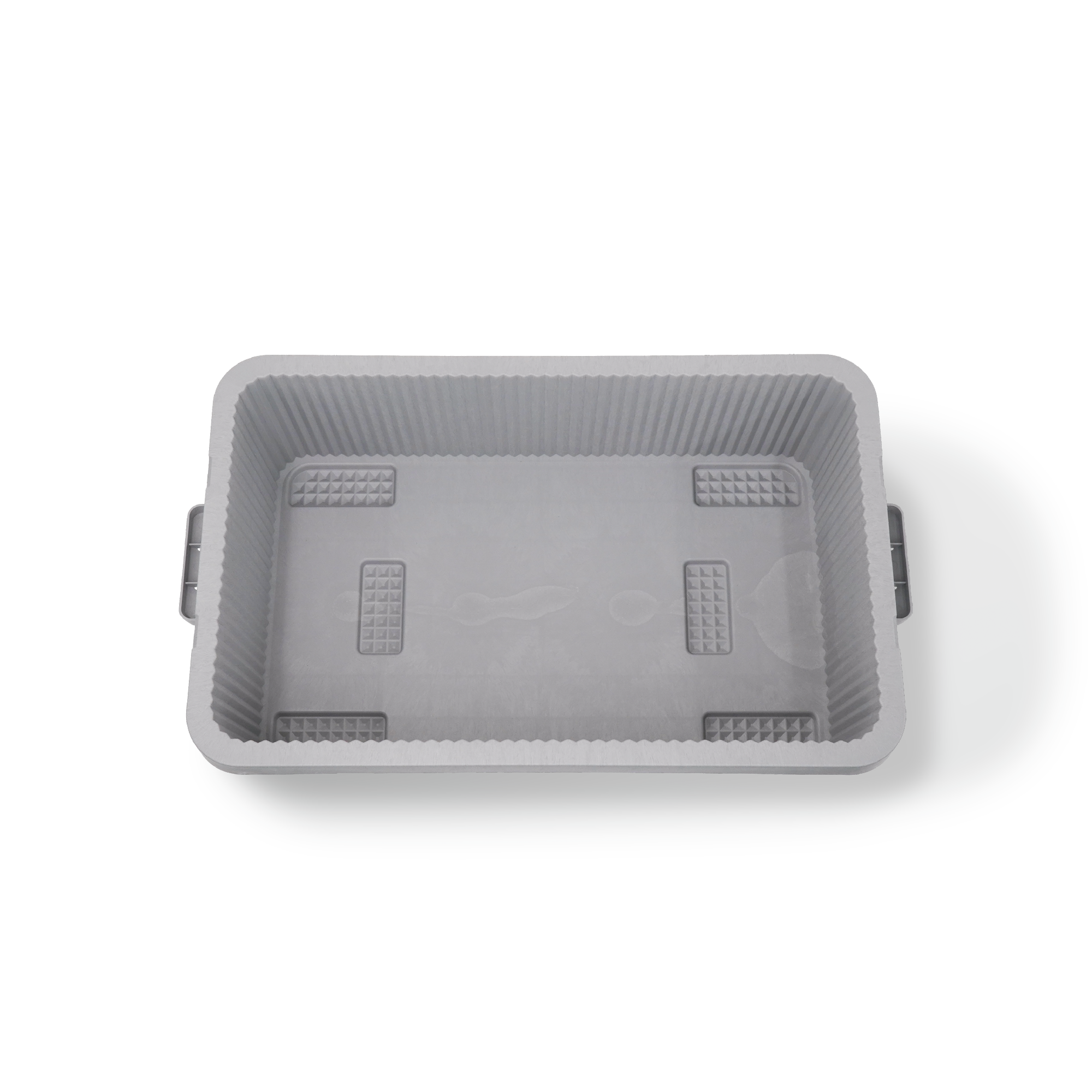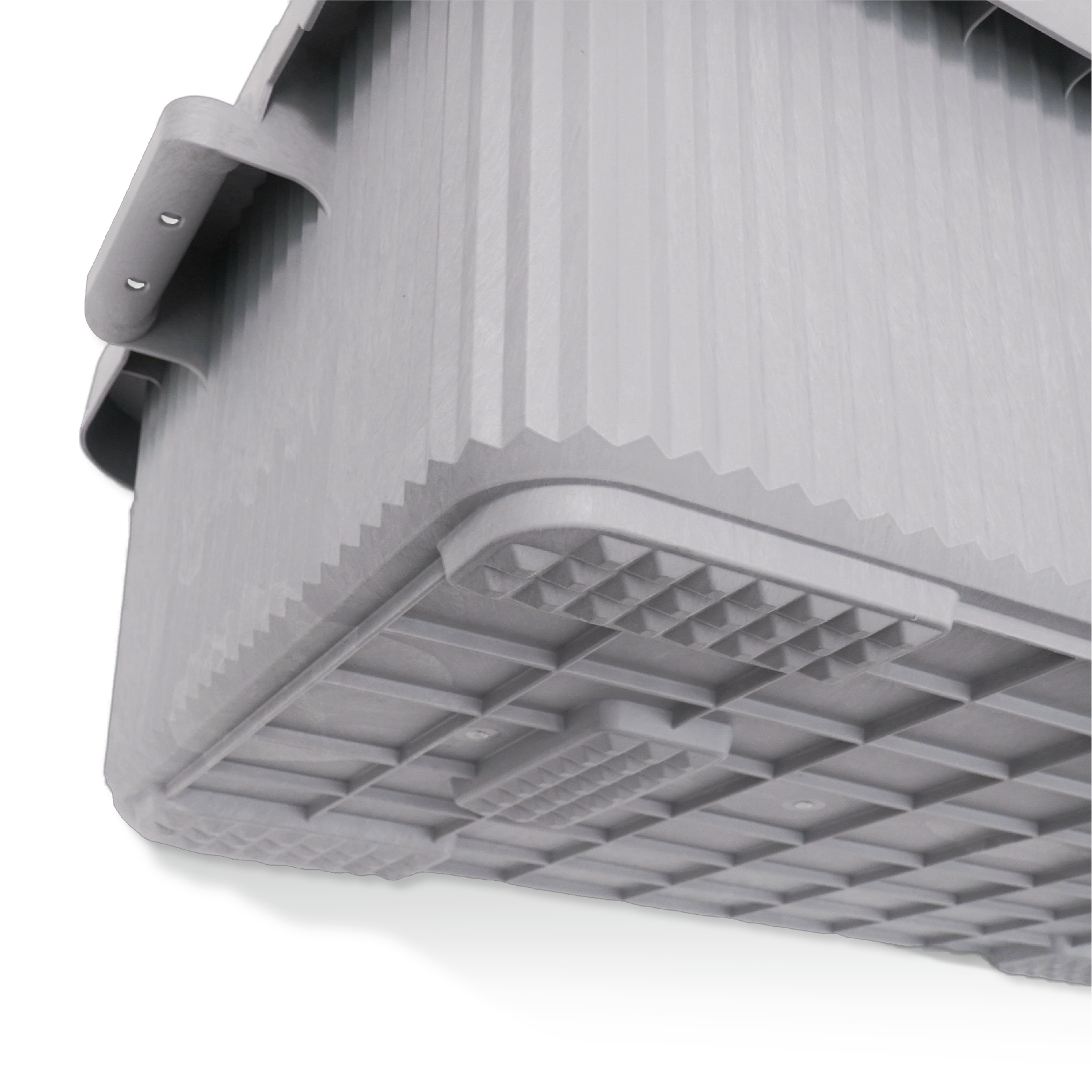 表面に凹凸構造を施した、耐久性と容量を両立させたデザイン。衝撃にも優れ、車のトランクや屋外でも安心してお使いいただけます。また、スパイクジョイント構造により縦にも横にも積み重ねができ、スペースに対して自由度の高い収納を実現。最大3段まで積み重ねて使用可能です。