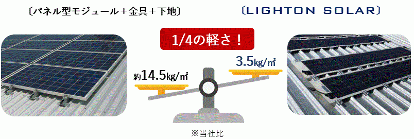 ライトンソーラーは、荷重負荷などの原因で設置を諦めていた屋根に対し、太陽光発電設備の設置を可能にする超軽量太陽光システムです。カバー工法で長寿命化させた屋根上にも設置でき、長期的なカーボンニュートラルに貢献します。ライトンソーラーは軽量フレキシブル太陽光モジュールを独自開発の金具で設置します。従来のパネル型太陽電池モジュールのシステム重量が約14.5㎏/㎡に対し、ライトンソーラーは3.5㎏/㎡と4分の1以下※の軽量化を実現しました。