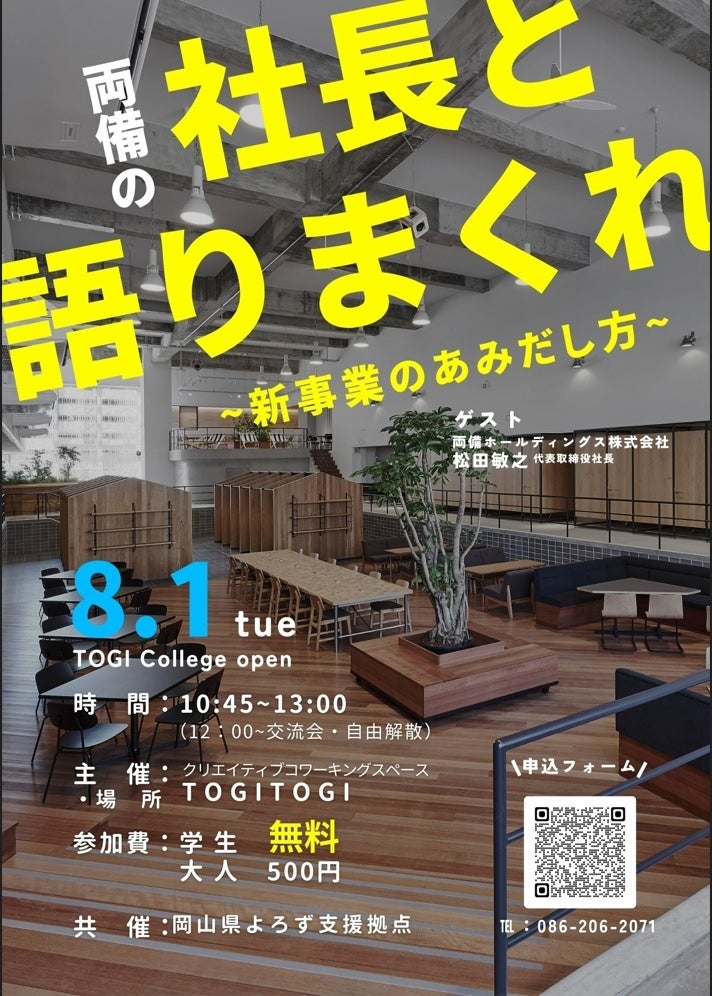 この度、その「TOGI College」の初回となるイベントを、下記の通り、2023年8月1日(火)に企画しました。岡山県よろず支援拠点のご提案により、弊社両備ホールディングス社長・松田敏之が講演を務め、「両備の新しい事業や取り組みはどのようにして生まれるのか!?」などについてお話させていただきます。