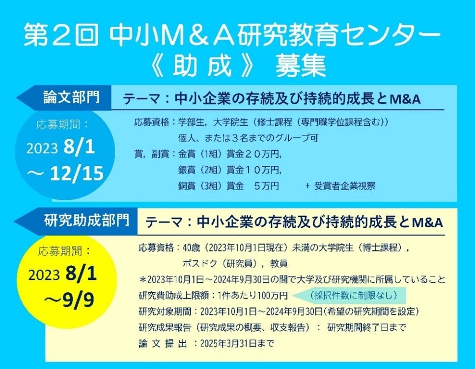 2022年度の第1回中小M&A研究教育センター助成募集では、【研究助成部門】で11件の研究課題を採択し、【論文部門】で2件が金賞を受賞しました。今回の第2回助成では、対象を神戸大学から全国の大学へと拡大し、論文部門・研究費助成部門の2部門で募集を行います。皆様のご応募をお待ちしています。