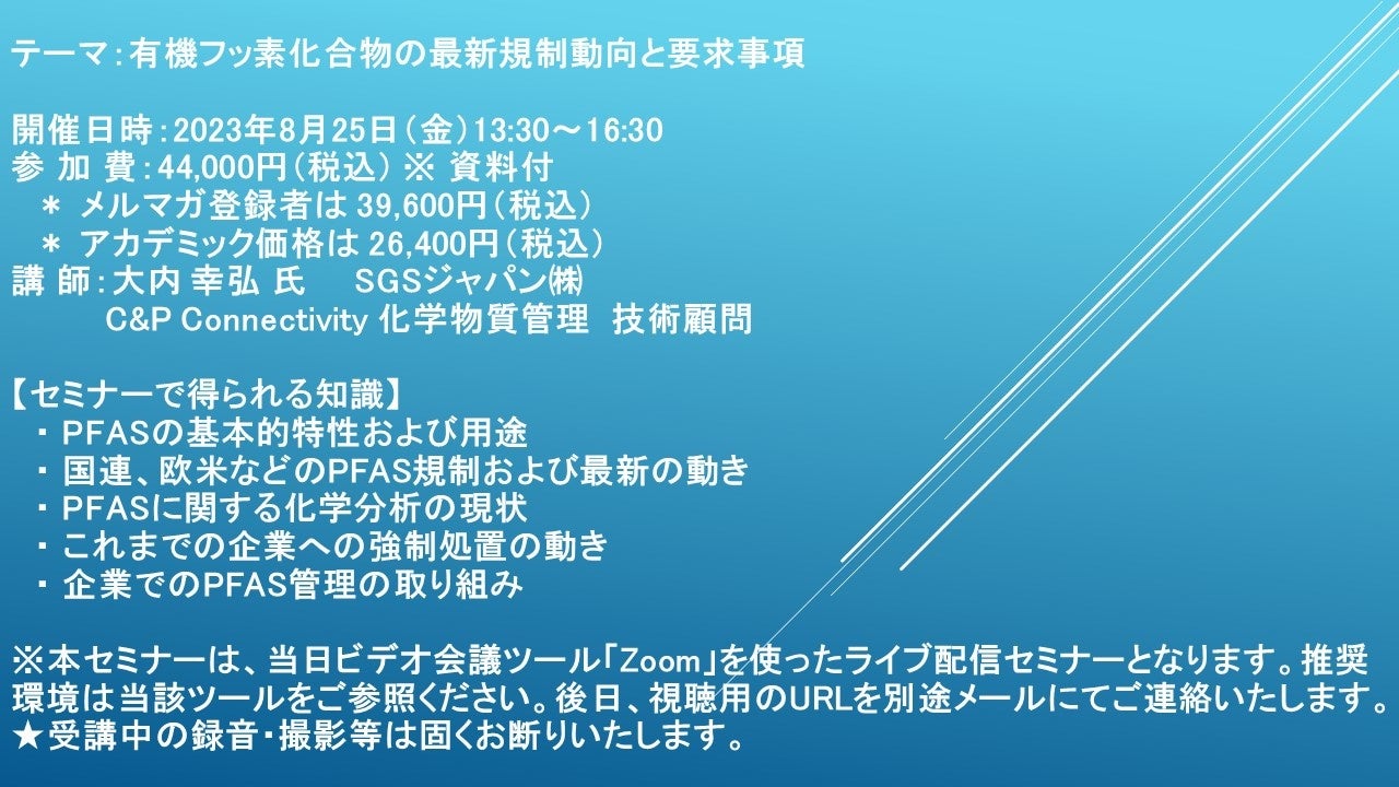 各企業での品質管理部門、生産部門、開発部門など、現在のPFAS規制の現状および最新情報を入手されたい方