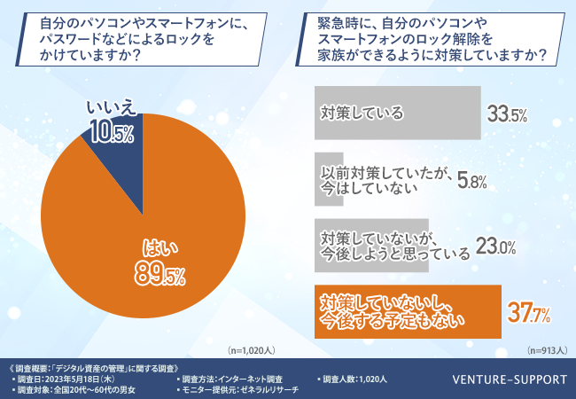スマホやパソコンにパスワードなどのロックをかけている人は約9割。緊急時に備えた対策状況として「現時点で対策していない」割合は6割以上という結果に