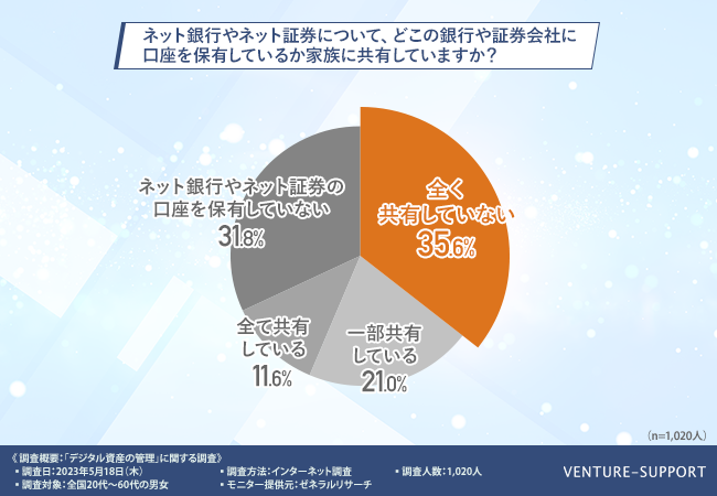「ネット銀行やネット証券について、どこの銀行や証券会社に口座を保有しているか家族に共有していますか?」と質問したところ、「全く共有していない(35.6%)」「一部共有している(21.0%)」「全て共有している(11.6%)」「ネット銀行やネット証券の口座を保有していない(31.8%)」という回答結果になった。