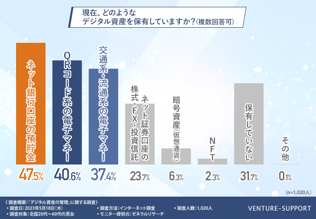 20代〜60代の男女が保有するデジタル資産として「ネット銀行口座の預貯金」や「QRコード系・交通系・流通系電子マネー」が上位に上り、生活と密接に関わるデジタル資産を保有していることが分かった。
