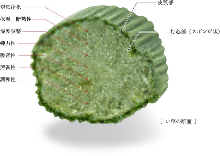 い草のスポンジ構造には湿気が多い環境では水分を吸収し、乾燥した環境で保持している水分を放出する調湿機能があります。