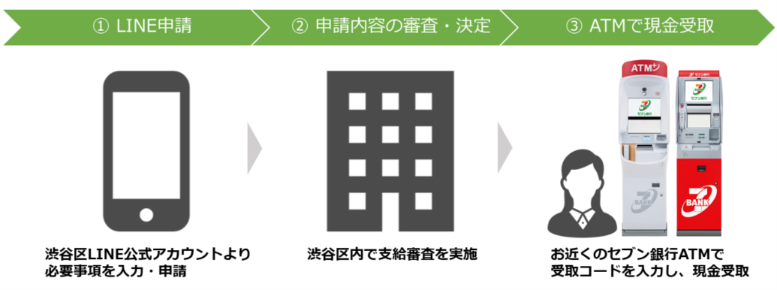 【LINEで申請、セブン銀行ATMで受取の流れ】
