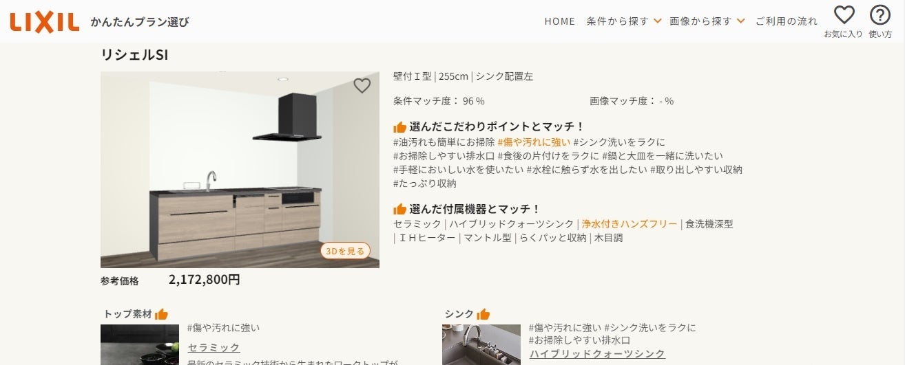 選んだ条件にヒットしたプランの1つをクリックすると、価格、形状、サイズ、カラー、マッチ度、360°商品を確認することができる「3D画像」、搭載された機器の詳細説明が表示されるほか、お客さまが選んだ「こだわりポイント」と「付属機器」のうち、マッチしているものが色(オレンジ)付きで表示され確認できます。
