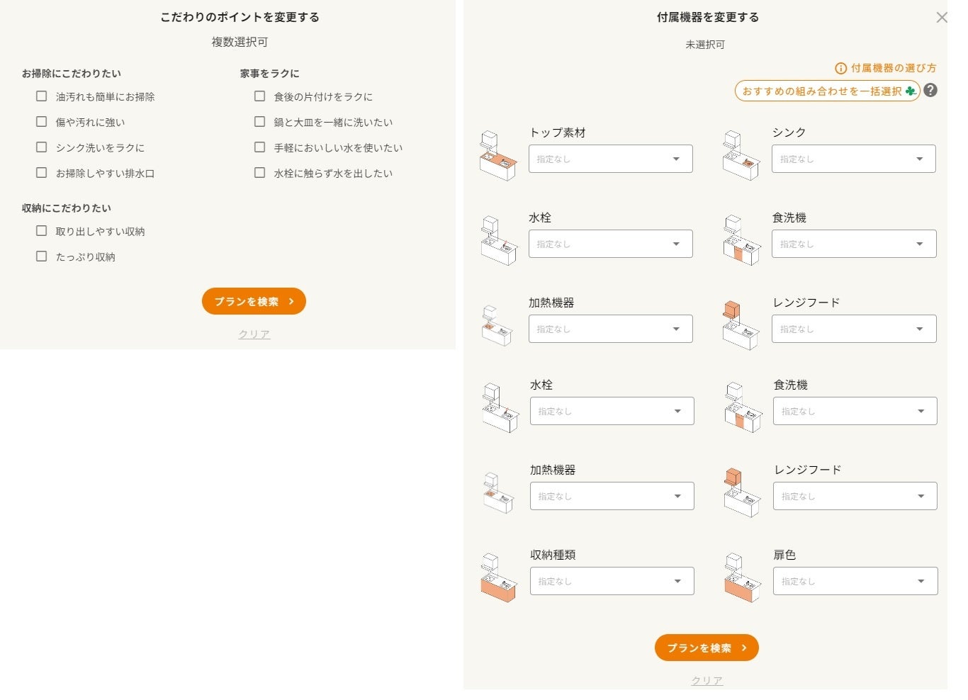「こだわりポイントを選ぶ」、「付属機器を選ぶ」では選びやすい選択式