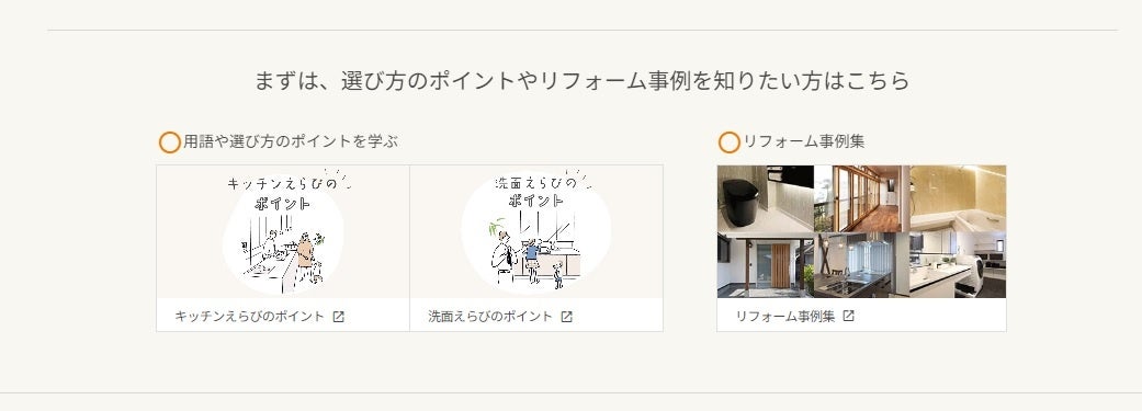 トップページ下段には、いきなり商品を選定するにはハードルが高い方に向けて、商品を選ぶ際のポイントやコツ、または実際のリフォームの事例をご紹介するサイトへリンクしています。