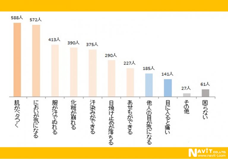 • 汗をかいて困ることは「肌がベタつく」がトップ